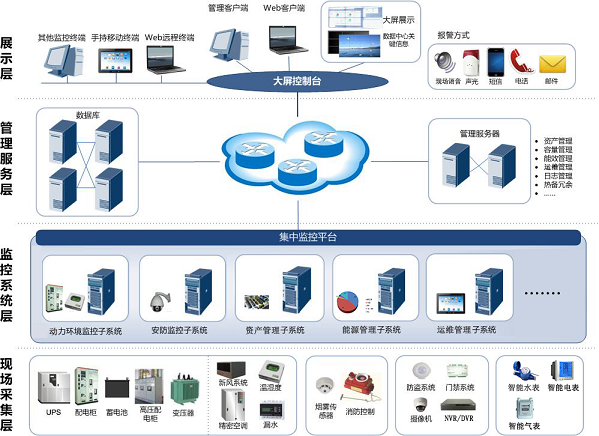 数据中心基础设施分为动力系统监控、环境设备监控、安防系统监控、IT设备监控、消防系统监控;所有设备集中监控,集中管理、及时预警、及时维护。