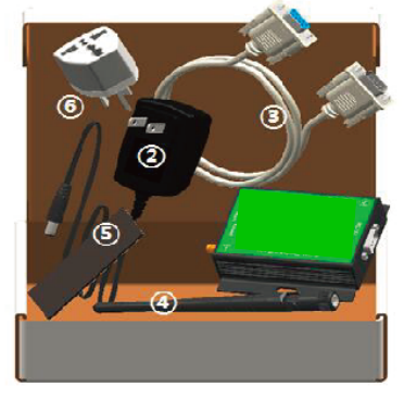 ①. 智能智盒本体 ②. 智盒电源适配器 ③. 串口通信线 ④. 天线(T C P型无天线) ⑤. 背胶磁铁(用于将智盒吸附机器) ⑥. 万能转换插头 |