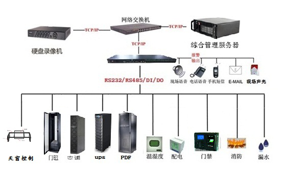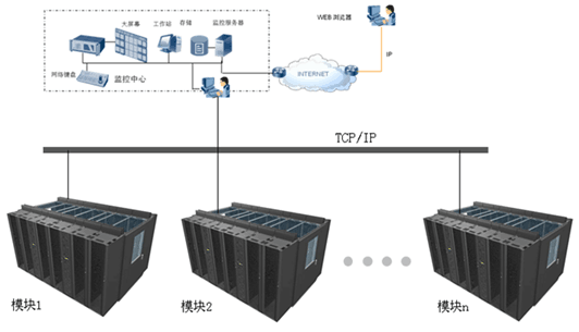模块化数据中心的监控量做为集中监控系统中的一个组成部分,通过交换机,将信号统一上传至中心机房的服务器上。